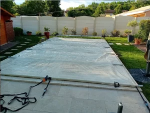 Une fois le bassin terminé, Christophe s’est rendu sur place afin d’effectuer un relevé précis des dimensions. Ce mesurage minutieux a permis de commander un liner entièrement sur-mesure, conçu pour s’adapter parfaitement à la géométrie du bassin, avec toutes les brides nécessaires pour les pièces à sceller : bonde de fond, skimmer, projecteurs, prise balai et refoulement. Chaque détail a été pensé pour garantir une installation impeccable et durable.